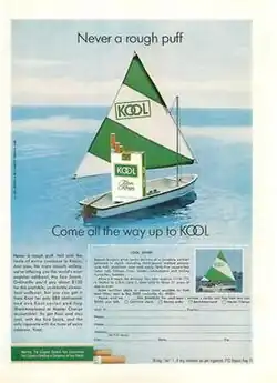 In 1971, Kool cigarettes initiated an advertising campaign where consumers could mail order a Snark with the Kool logo on the sail for $88 (later $99) along with one KOOL carton flap; delivery was included. These were early (non-ABS) versions and retailed at the time for $120. As one of KOOL's highest-scoring ads, the company received over 18,000 orders for Sea Snarks in 1971 and the campaign was repeated in 1972.[16] The Snark/Kool campaign won a national POPI award (given by the Point of Purchase Institute) as the most creative and inventive ad of 1971.[13] The KOOL Snark promotion was repeated in 1972, adding the option of credit card payment, and again in 1975 for $139.
