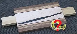 The presenter rubs a pencil on his workpiece, gets multiple stripes and announces that the end is "significantly" and "much" lower than the main part of the wood.