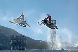 Snocross (also snowcross) is a racing sport involving racing specialized high performance snowmobiles on natural or artificially-made tracks consisting of tight turns, banked corners, steep jumps and obstacles. Riders race at speed of up to 60 miles per hour (96 kilometres per hour).[1] Jumps are up to 30 feet (9.1 meters) tall, so riders travel up to 130 feet (40 meters) before they touch the ground.[1] According to the World Snowmobile Association which governs snocross, watercross, and hillcross racing, snocross is the most popular form of snowmobile racing.[2]