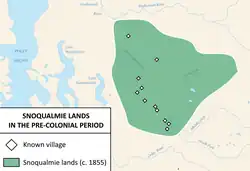 The traditional territory of the Snoqualmie consists of the Snoqualmie River watershed, from North Bend downriver to its confluence with the Skykomish.[16] Although it is difficult to determine the exact locations and boundaries, the Snoqualmie also traveled widely throughout the Cascade mountains adjacent to their territory.[5]