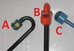 Among recent innovations is the "collapsible snorkel", which can be folded up in a pocket for emergencies for scuba divers who may not need a snorkel on every dive.[69] One for competitive swimmers is a lightweight training snorkel with twin inlet tubes, which exhausts through a valve underwater, similar to the exhaust valve of a diving demand valve, so the dead space is restricted to the mouthpiece volume;[70] another is a "restrictor cap" placed inside a snorkel barrel "restricting breathing by 40% to increase cardiovascular strength and build lung capacity".[71] Some additional snorkel features such as shut-off and drain valves fell out of favour decades ago, only to return in the contemporary era as more reliable devices for incorporation into "dry" and "semi-dry" snorkels.[61]