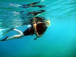 Snorkelling is the practice of swimming face down on or through a body of water while breathing the ambient air through a snorkel, usually with swimming goggles or a diving mask, and swimfins. In cooler waters, a wetsuit may also be worn. The snorkel may be an independent item or integrated with the mask. The use of this equipment allows the snorkeler to observe the underwater environment for extended periods with relatively little effort, and to breathe while face-down at the surface.[63]