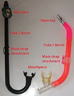 A snorkel is a device used for breathing atmospheric air when the wearer's head is face downwards in the surface water with the mouth and the nose submerged. It may be either a separate unit, or integrated into a swimming or diving mask. The integrated version is only suitable for surface snorkeling, while the separate device may also be used for surface breathing during breathhold underwater activities such as spearfishing, freediving, finswimming, underwater hockey, underwater rugby and for surface breathing while wearing scuba equipment. A standard snorkel is a curved tube with a shape usually resembling the letter "L" or "J", fitted with a mouthpiece at the lower end and made from plastic, synthetic elastomers, rubber, or light metal.[1] The snorkel may have a loop or a clip to attach it to the head strap of the diving mask or swimming goggles, or may be tucked between the mask-strap and the head,[2] or may be provided with its own head strap. Some snorkels are fitted with a float valve at the top to prevent flooding if the top opening is immersed, and some are fitted with a water trap and purge valve, intended for draining water from the tube.