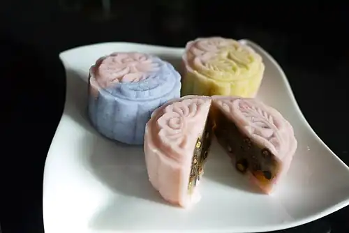 Snow skin mooncake, snowy mooncake, ice skin mooncake or crystal mooncake is a Chinese confection eaten during the Mid-Autumn Festival. It is a cold mooncake with glutinous rice skin, originating from Hong Kong.[1] [2] Snow skin mooncakes are also found in Macau, mainland China, Taiwan, Singapore, Malaysia and Indonesia.[3] Although snow skin mooncakes are usually made and sold by bakeries, these mooncakes are not baked in ovens like traditional cakes. Unlike traditional mooncakes which are served at room temperature, snow skin mooncakes are typically eaten cold.