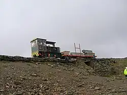In 2006 the Snowdon summit café was demolished and construction of a new visitor centre was started. While this construction was taking place passenger trains terminated at Clogwyn, but the line and a works train was still used to transport workers and materials to the project. On some days, however, the train could not reach the summit and the workers had to walk down to Rocky Valley.[23] The new building, Hafod Eryri (loosely translated from Welsh as "high summer residence of Snowdonia"),[24] was officially opened by First Minister Rhodri Morgan on 12 June 2009.[23]