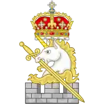 The badge of office is Issuant from battlements Proper a unicorn’s head erased Argent, horned and crined and grasping in his mouth the sword Excalibur Or all ensigned of the Crown of Scotland Proper. The granting of this badge completed the devising of badges for all the ordinary and regularly used extraordinary officer of arms titles.[4]