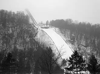 The Snowflake Ski Jump is a ski jumping hill north of Westby, Wisconsin, United States, in Timber Coulee. It is host to a ski jumping tournament that has taken place annually since 1961. The hill, the seventh-largest in North America, is categorized as a large hill, which means it has a K-spot of 106 meters.[4] The official record of 130.0 meters was achieved by Fredrik Bjerkeengen of Norway on February 10, 2008.[5]
