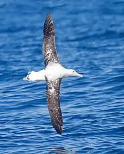 The snowy albatross (Diomedea exulans), also known as the wandering albatross, white-winged albatross, or goonie, is a large seabird from the family Diomedeidae; they have a circumpolar range in the Southern Ocean. It is the largest species of albatross and was long considered to be the same species as the Tristan albatross and the Antipodean albatross. Together with the Amsterdam albatross, it forms the wandering albatross species complex, which some began referring to more recently as "snowy".[3]