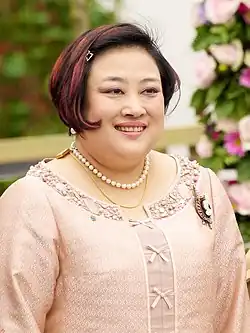 After her divorce from the crown prince, the king, by royal proclamation, gave her a new title on 12 August 1991. Her official full title became Phra Worarachathinatdamat (Thai: พระวรราชาทินัดดามาตุ), meaning the mother of the king's first grandchild (translated into English as The Princess Mother of the King's First Grandchild). She thus retained her title as princess and remains a member of the Thai royal family.[1] In 2019, she was granted a new title and the higher rank of "Krom Ma Meun" by King Vajiralongkorn.[2]