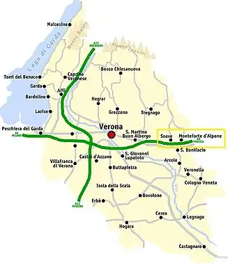 The Soave production zone is situated in the eastern part of the hills in the province of Verona (north of the Serenissima highway, between the 18th and 25th kilometres of the Verona-Venezia road). The zone includes part or all of the lands belonging to the municipalities of Soave, Monteforte d'Alpone, San Martino Buon Albergo, Lavagno, Mezzane, Caldiero, Colognola, Illasi, Cazzano, Roncà, Montecchia and San Giovanni Ilarione.