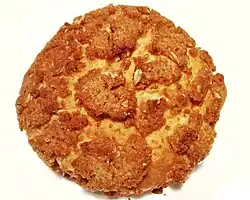 Soboro-ppang (Korean: 소보로빵), or gombo-ppang (곰보빵; standard language), often translated as soboro bread, soboro pastry, or soboro bun, and also known as Korean streusel bread,[1] is a sweet bun with a streusel-like upper crust popular in Korea. The bun is made of flour, sugar, eggs, and dough and baked with a crisp, bumpy surface on top. The word "soboro" is a Japanese word which refers to the streusel topping of the bun, which is often made with peanut butter as a key ingredient. Soboro refers to fried and minced meat or fish in Japanese, which resembles the streusel on top of the bread.[2]