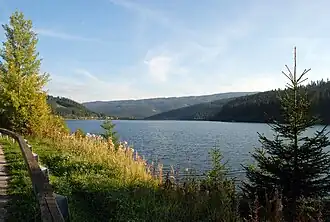 Soboth reservoir (German: Stausee Soboth or Soboth See, Slovene: Jezero Sobote) is an artificial reservoir in Austria created in 1990 when an embankment dam on the Feistritz stream was created to power the Koralpe hydroelectric power plant. The artificial lake is located in the Koralpe mountain range, near the Soboth village, beside the road connecting Lavamünd and Graz, close to the Soboth Pass near the Slovenian-Austrian border. Its elevation is about 1080 m above sea level. Its natural drainage basin has an area of 29.7 km². The reservoir is around 2 km long and up to 500 m wide, has a surface area of 0.8 km2 and is up to 80 m deep. In summer, the lake is a popular place for swimming[1][2] due to its clean water, cooler climate due to its high elevation, and natural surroundings consisting of spruce-covered hills.