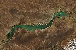 The Sobradinho Reservoir (Portuguese: Lago de Sobradinho) is a large reservoir located in Sobradinho, north of the Brazilian state of Bahia. The reservoir measures approximately 320 km (200 mi) long, 4,214 km2 (1,627 sq mi) in surface area, and a storage capacity of 34.1 km3 (8.2 cu mi) at its nominal elevation of 392.5 m (1,287.7 ft), making it the 15th largest reservoir (artificial lake) in the world. The lake encloses the waters of the São Francisco River, one of the largest and most important rivers in Brazil.