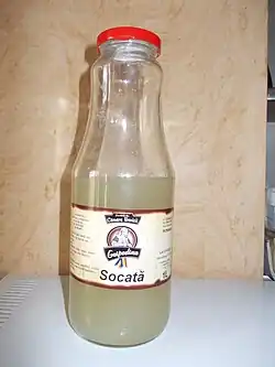 Socată[1] or suc de soc is a traditional Romanian soft drink made from the flowers of the European elder (or elderberry) shrub, Sambucus nigra (soc in Romanian). It may be non-alcoholic or, usually, low-alcoholic, and can be carbonated or non-carbonated, depending on the fermentation type and duration. It is produced by the natural fermentation of elder flowers in a lemon and sugar or (traditionally) honey solution. Raisins, lemon or lime slices and various spices (mint, lemon or orange zest, basil leaves) may be added. Some newer variations substitute raisins or dates for sugar or honey, and limes instead of lemons as well as additional spices such as saffron or ginger may be used. Yeast and/or rice grains can be added to intensify alcoholic fermentation, if desired. Socată is popular throughout Southeast Europe, where it is also known as fermentirana zova (in Bosnia and Herzegovina, Serbia and Montenegro and gemišt od bazge in Croatia and Slovenia).