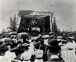 A key achievement of the Société de l'Assomption was organizing eight Acadian national conventions between 1900 and 1937.[11] Pascal Poirier was elected its first president in 1890, with Pierre-Amand Landry as the first secretary.[12] Meetings were held at Collège Saint-Joseph in Memramcook.[12] The Fourth Acadian National Convention in Arichat in 1900 was attended by Prime Ministers Wilfrid Laurier and George Henry Murray.[12] Delegates discussed the "Acadianization" of the clergy, the appointment of an Acadian bishop, and the need for newspapers to collaborate in defending Acadian interests.[12] The promotion of French-language education in Nova Scotia was a major focus, as reported in newspapers.[12] Poirier and Landry actively lobbied the clergy and the Vatican for an Acadian bishop, straining relations with Atlantic Canada's bishops.[12] Poirier resigned in 1904 as a result.[12]
