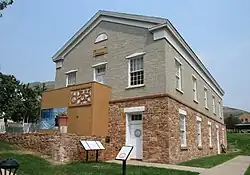 Ground was broken for the replica's construction at the park in September 1979.[72] Park officials had planned to replica the building using adobe brick like the original, but difficulties in producing the pioneer-building material surfaced and concrete slump blocks were used instead.[73] On July 24, 1980, the completed building was dedicated by church president Spencer W. Kimball, with Utah Governor Scott M. Matheson cutting the ribbon.[74][75] When larger-scale excavations of the Social Hall site occurred during construction of a tunnel in 1991, it was discovered that the hall was a different size than previously understood, and the park's replica had been built with different dimensions than the original.[2]