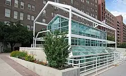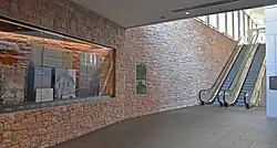During construction of the 95 State at City Creek high-rise office tower, the museum was demolished. It was replaced by the Social Hall Plaza Pavilion which serves as the eastern entrance to the tunnel, now known as "The Link." A small memorial exhibit was constructed on the lower level of the new entrance, which features a display with artifacts related to the Social Hall.[88][89] Surrounding the display, pieces of the Social Hall's cut-up sandstone foundation were built into the walls.[90]