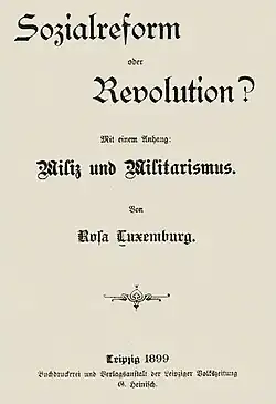 Social Reform or Revolution? (German: Sozialreform oder Revolution?) is an 1899 pamphlet by Polish-German Marxist theorist Rosa Luxemburg.[1] Luxemburg argues that trade unions, reformist political parties and the expansion of social democracy—while important to the proletariat's development of class consciousness—cannot create a socialist society as Eduard Bernstein, among others, argued. Instead, she argues from a historical materialist perspective that capitalism is economically unsustainable and will eventually collapse and that a revolution is necessary to transform capitalism into socialism. The pamphlet was heavily influential in revolutionary socialist circles and along with Luxemburg's other work an important precursor to left communist theory.