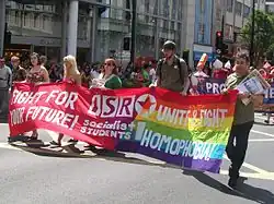 In the United Kingdom, the 1980s saw increased LGBT rights opposition from the right wing Conservative government led by Margaret Thatcher, who introduced Section 28 in 1988 in order to prevent what they saw as the "promotion" of homosexuality as an acceptable lifestyle in schools. However, the Conservatives' main opposition, the Labour Party, did little to address the issue of LGBT rights, ignoring calls from left-wingers such as Ken Livingstone, to do so.[75] Meanwhile, the popular right-wing press featured pejorative references to lesbians, supposedly especially associated with the all-female anti-nuclear protest camp at Greenham Common,[76] and individuals such as Peter Tatchell, the Labour candidate in the 1983 Bermondsey by-election. However, the growing commercialisation of the western gay subculture in the late 20th and early 21st centuries (the "pink pound") has come under heavy criticism from socialists. Hannah Dee remarked that it had reached "the point that London Pride – once a militant demonstration in commemoration of the Stonewall riots – has become a corporate-sponsored event far removed from any challenge to the ongoing injustices that we [the LGBT community] face."[77] At the same time, an anti-war coalition between Muslims (many organized through mosques) and the Socialist Workers Party led a leading member Lindsey German to reject the use of gay rights as a "shibboleth" that would automatically rule out such alliances.[78]
