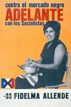 1973 election poster for PS candidate Fidelma Allende. Slogan reads: Against the Black Market – Forward with the Socialists.