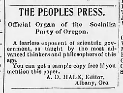 - ^ "Oregon Socialists, Attention," Social Democratic Herald [Chicago], vol. 2, no. 38, whole no. 88 (March 10, 1900), pg. 3.