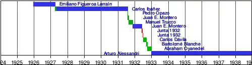 Over the course of the years 1926 and 1927, General Carlos Ibáñez del Campo maneuvered his way into power, first as the Minister of War, then Minister of the Interior, then Vice President, before finally on May 4, 1927, President Figueroa resigned as president.[3] Between 1927 and 1931, Chile was governed by General Carlos Ibáñez del Campo, who carried out a corporatist policy, in order to undermine the influence of leftist groups.