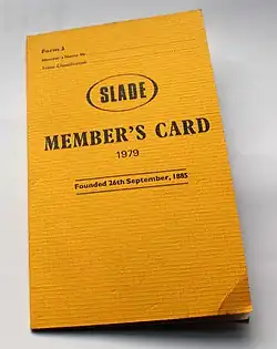 The United Society of Engravers merged into SLADE in 1972, which promptly formed a wallpaper and textiles section. In 1975, the Slade Art Union was formed as an autonomous section of SLADE, hoping to attract workers involved in preparing photography and art.[2]