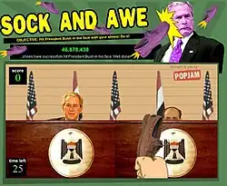 Sock and Awe is a minimalist 2008 Flash game created by British entrepreneur Alex Tew, recreating the Bush shoeing incident and putting the player in control of journalist Muntadar al-Zaidi who flung a shoe at George W. Bush during a news conference. Although the game was hastily put together, it went viral and received widespread news coverage right around its release, only a day after the actual incident.[1][2][3][4][5][6] It is a well-known example of a newsgame.[7] The name of the game is a pun on the US shock and awe military tactic.[8][9]