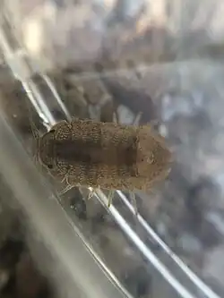 The body size of the Socorro isopod is sexually dimorphic, varying noticeably depending on gender. Males tend to reach 7.1 millimeters in length on average (4-13 millimeter range). Meanwhile, females tend to reach 5.1 millimeters in length on average (4.5-6 millimeter range).[3] Both sexes are gray to reddish-brown in color, with the edges of their bodies being tinted bright orange.[5] Their body is flattened and segmented, with the last body segment possessing uropods. They have seven pairs of legs and a pair of antennae on their head.[3]