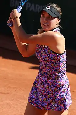 Kenin greatly improved in 2019, rising from outside the top 50 at the start of the year to just outside the top ten by the end of the season.[24] She began her year by winning her first WTA doubles title at the Auckland Open with Eugenie Bouchard.[39] The following week, she won her first WTA singles title at the Hobart International without dropping a set during the event. She upset the top seed and No. 19 Caroline Garcia in the first round, before defeating Anna Karolína Schmiedlová in the final.[40] With this success, Kenin rose to what was at the time a career-best ranking of No. 37.[41] At the Australian Open, she pushed world No. 1 Simona Halep to three sets in the second round, ultimately losing in a long two-hour-and-thirty-minute match.[42] The following month, Kenin reached another WTA final at the Mexican Open, finishing runner-up to Wang Yafan despite being up a set and a break.[43] During the clay-court season, Kenin improved on her results from the previous year. She reached the third round at the Italian Open, defeating compatriot Madison Keys before losing to Plíšková. Her best result on clay came at the French Open, where she reached the fourth round. During the event, she upset world No. 10, Serena Williams, in the third round before losing to eventual champion Ashleigh Barty.[44][45]