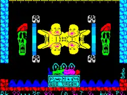 The game world consists of a number of rooms and passages with background scenery including a machine which stretches four conjoined babies and men being torn apart on racks. The game's rooms are filled with enemies and traps such as spiked ceilings, falling anvils and airborne spinning blades. The player character is armed with a laser gun and a jet pack which is used to fly around the game world.[2] The laser can overheat and become inoperable for a time if not used sparingly.[4] Scenery and surfaces can be degraded then destroyed by repeated laser fire, allowing access to adjacent rooms which would otherwise be unreachable or require a detour.[2] The player starts each game with three lives;[4] the game's display features a heart strength indicator which is reduced each time the player is injured. If the player loses all their heart strength, their heart stops, resulting in a lost life. Players can render themselves invisible and invincible for a limited period three times on a single life. When the player character is invisible, he can fire the laser in order to determine his current location.[3][4]
