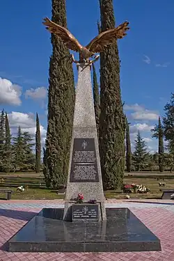 Tehlirian died in 1960 of a cerebral hemorrhage,[26] and is buried at the Ararat Cemetery in Fresno, California. Tehlirian's monument-grave is an obelisk with a gold-plated eagle slaying a snake on top. It is reported that the original artist of the monument was quoted as saying that the eagle was "the arm of justice of the Armenian people extending their wrath onto Talaat Pasha," who was symbolized by the snake. The monument itself is centered in the middle of the cemetery with a walkway made of red brick surrounded by cypress trees.[1]