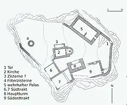 The ruins of the castle are located on a steep hill west of Trin village. The ruins of the Church of St. Pancras are located in the center of the 50 by 80 meters (160 ft × 260 ft) flat top of the hill. The simple church building is oriented along an approximate east-west axis. It dates from about 1100 and may have replaced an earlier church. A rectangular cistern or baptistery was added in the 12th century.[6] The 11th- or 12th-century tower south of the tower is 11 m × 7 m (36 ft × 23 ft) with walls that are up to 1.8 m (5.9 ft) thick. The palas to the north was added in the 13th century and is 18 m (59 ft) long.[3]