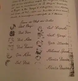 According to Edith Durham, in 1912 Montenegro worked hard to rise the Malissori in exchange for arms and freedom, and they believed Montenegro's claimed intent to 'liberate their brethren'.[13] During her war correspondence in the winter of 1913, Durham details her conversation with Sokol Baci and his son, Kole Sokoli, who stated that they were fighting to free Albania from the Ottomans.[16] After the Montenegrin conquest of Scutari (1913), Nicholas I appointed Sokol Baci the commander (vojvoda) and brigadier of Scutari. When congratulated on his appointment, Sokol replied, "He who does not see through the screen, may his eyes fall out!" On May 26, 1913, 130 leaders of the Gruda, Hoti, Kelmendi, Kastrati and Shkreli sent a petition to Cecil Burney in Shkodër against the incorporation of their territories into Montenegro.[17] Sokol broke ties with Nicholas I and lived in Shkodër for the remainder of his life. On November 14, 1918, Luigj Gurakuqi, Anton Harapi and Gjergj Fishta led the leaders of the Hoti and Gruda on a march from Montenegro to Shkodër, where they submitted a memorandum to the French Colonel, Bardy de Fourton. The memorandum was addressed to the Ministers of Foreign Affairs in Washington, London, Paris and Rome requesting that Hoti and Gruda be united with Albania, signed by the chiefs of Gruda, including Sokol's closest cousins, Dede Nika Ivezaj, Zef Martini Ivezaj, Mirash Hasi Ivezaj and Marash Pllumi Ivezaj.[18]