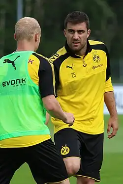 On 5 August 2017, as the captain of the club, he lost the 2017 DFL-Supercup on penalties' game against Bayern Munich. On 17 September 2017, he scored at the end of the first half against 1. FC Köln, giving a lead of two goals in his club. It was his first goal for the 2017–18 season and was secured with the use of VAR (Video Assistant Referee) method.[50] On 14 October 2017, Borussia Dortmund's unbeaten start to the season was ended by RB Leipzig's 3–2 away win, as the Greek defender initially in trying to push the ball away helped Leipzig winger Yussuf Poulsen to score, while at the beginning of second half, was sent off for a foul in the box and Jean-Kévin Augustin scored the penalty.[51] On 17 October 2017, after losing its UEFA Champions League opening games in Group H to Tottenham Hotspur and Real Madrid, Dortmund needed a win to kick-start its campaign in Europe's premier club competition, but they succeeded only to seal an away draw against Cypriot champions APOEL, as the Greek defender equalised with a header to Mario Götze's cross.[52][53] On 4 November 2017, in the derby against rivals Bayern Munich he suffered a leg injury, during the first half, and was substituted by Jeremy Toljan,[54] and two weeks later in an away game against VfB Stuttgart has received a heavy blow and replaced at the end of the first half from Dan-Axel Zagadou.[55]
