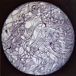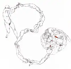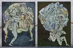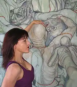 Kjøk specializes in painting, drawing and performance with a focus on the nude figure.[18] New York art critic Meghan Dailey describes her core themes as "the body, its limits and the tension between its strength and its vulnerability."[19] In contrast to other artists who portray the nude at rest, Kjøk's bodies are usually in constant motion. This dynamic quality springs from her unique, highly athletic, immersive artistic technique. Her work begins in her studio, with she and her models engaging in an acrobatic process, "which incorporates picture taking, laborious posing and performance, cutting, collaging, rearranging and finally meditative reassemblage through drawing and painting..."[20]