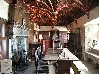 The solar was almost ubiquitous among late castles across the British Isles, such as Broughton Castle, in Oxfordshire,[3] and Stokesay Castle in Shropshire.[4] In the medieval house of Great Dixter, in East Sussex, it consists of three rooms and a fireplace from the late 15th century.[5] In Windsor Castle its walls are painted green with gold stars.[2]