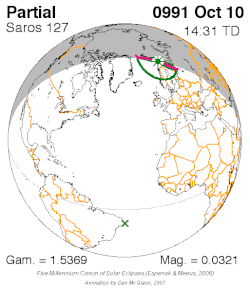 | 127 | 1 | October 10, 991 | 14:31:21 | Partial | 71.5N 28.4E | 1.537 | 0.0321 | [1] | ||