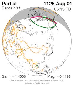 | 131 | 1 | August 1, 1125 | 5:15:09 | Partial | 69.9N 109.5W | 1.4666 | 0.1198 | [1] | ||