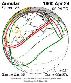 | 135 | 27 | April 24, 1800 | 0:24:00 | Annular | 45.7N 151.3E | 0.6125 | 0.9417 | 269 | 5m 27s | [27] |