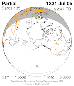 | 135 | 1 | July 5, 1331 | 22:46:38 | Partial | 67.8N 12.6E | 1.5532 | 0.0063 | [1] | ||