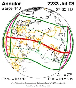 | 140 | 41 | July 8, 2233 | 7:35:24 | Annular | 35.1N 73.1E | 0.2215 | 0.9809 | 70 | 1m 59s | [41] |