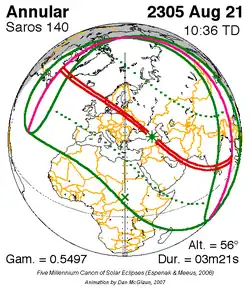 | 140 | 46 | September 1, 2323 | 17:26:09 | Annular | 41.7N 55.3W | 0.6253 | 0.9584 | 191 | 3m 48s | [46] |