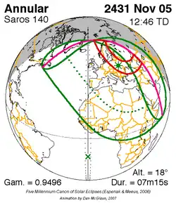 | 140 | 52 | November 5, 2431 | 12:45:40 | Annular | 49.5N 24.5E | 0.9496 | 0.9242 | 902 | 7m 15s | [52] |