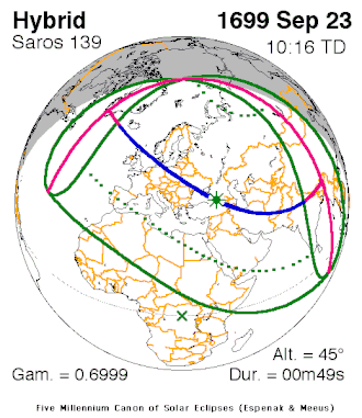A total solar eclipse occurred on September 23, 1699. A solar eclipse occurs when the Moon passes between Earth and the Sun, thereby totally or partly obscuring the image of the Sun for a viewer on Earth. A total solar eclipse occurs when the Moon's apparent diameter is larger than the Sun's, blocking all direct sunlight, turning day into darkness. Totality occurs in a narrow path across Earth's surface, with the partial solar eclipse visible over a surrounding region thousands of kilometres wide. A narrow path of totality just clipped the north-east corner of Scotland, including Wick.