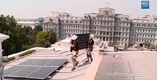 In 2010, Steven Chu, the secretary of energy under the Barack Obama administration, announced that solar panels would be reinstalled on the roof saying that "As we move towards a clean energy economy, the White House will lead by example".[3] The panels were installed in 2013, making it the first time solar power would be used for the president's living quarters.[8][5][7]