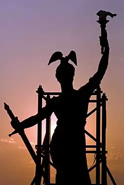 Brewster's Victory crowns the memorial.[44] Atop of the monument, Schmitz imagined a classical sculpture featuring a winged Nike, the Greek goddess of war, to symbolize victory in battle.[45] The statue, which became known as Indiana or Miss Indiana, is 30 feet (9.1 m) tall and weighs ten tons. It faces south and cost $12,500. The statue also includes a symbolic sword representing victory, a torch that signifies "the light of civilization", and an eagle, a symbol of freedom.[25][41]
