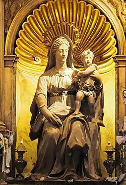 In Rome, in the Basilica of Saint Augustine, the Feast of the Maternity of the Blessed Virgin Mary was celebrated with an octave, in honour of the miraculous statue of the Madonna del Parto by Jacopo Sansovino. For centuries, the people of Rome and its environs have invoked the intercession of the Madonna before this statue asking for safe deliveries and healthy babies. The statue is laden with thanksgiving ex-votos and always surrounded by offerings of flowers and candles, and often photographs of smiling infants and toddlers, "visual evidence of faith in holy intercession".[15]
