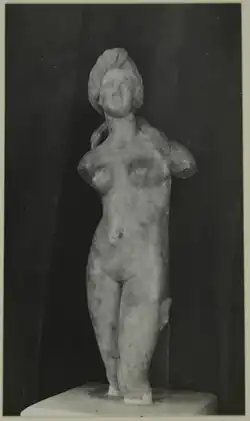 The marble sculptures found during the excavation were probably made from imported marble. It seems likely that the heads were made separately from the body and fitted together with an iron pin. Some sculptures have been mended. All the sculptures were once painted although the colours are faintly preserved. Other sculptures were made of alabaster, terracotta as well as soft and hard limestone. Some of the sculptures were found in situ and these were always located in connection to the cellae. The archeologists proposed that they probably were placed on the altars in the cellae. Therefore the altars might have been used as iconostasis, or a stand for the various sculptures. This was only observed with the sculptures in the cella, not the ones from the courtyards or outside. The sculptures from period 1 (250 B.C.) were all found in temple A. From period 2 (end of 2nd century B.C.) all the sculptures were found at temples B, C, and D. From period 3 (middle of 3rd century A.D.) and 4 (beginning of 4th century. A.D.) all the sculptures were found in temple E. The sculptures and inscriptions were used as the foundation for the archaeologist's identifications of the temples, therefore they might be the correct identification but it is not completely sure.[3]