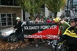 Chaplin was not pleased with the widespread popularity of "Solidarity Forever" in the labor movement. Late in his life, after he had become a voice opposing (State) Communists in the labor movement, Chaplin wrote an article, "Why I wrote Solidarity Forever", in which he denounced the "not-so-needy, not-so-worthy, so-called 'industrial unions' spawned by an era of compulsory unionism". He wrote that among Wobblies "there is no one who does not look with a rather jaundiced eye upon the 'success' of 'Solidarity Forever.'" "I didn't write 'Solidarity Forever' for ambitious politicians or for job-hungry labor fakirs seeking a ride on the gravy train.… All of us deeply resent seeing a song that was uniquely our own used as a singing commercial for the soft-boiled type of post-Wagner Act industrial unionism that uses million-dollar slush funds to persuade their congressional office boys to do chores for them." He added, "I contend also that when the labor movement ceases to be a Cause and becomes a business, the end product can hardly be called progress."[5]